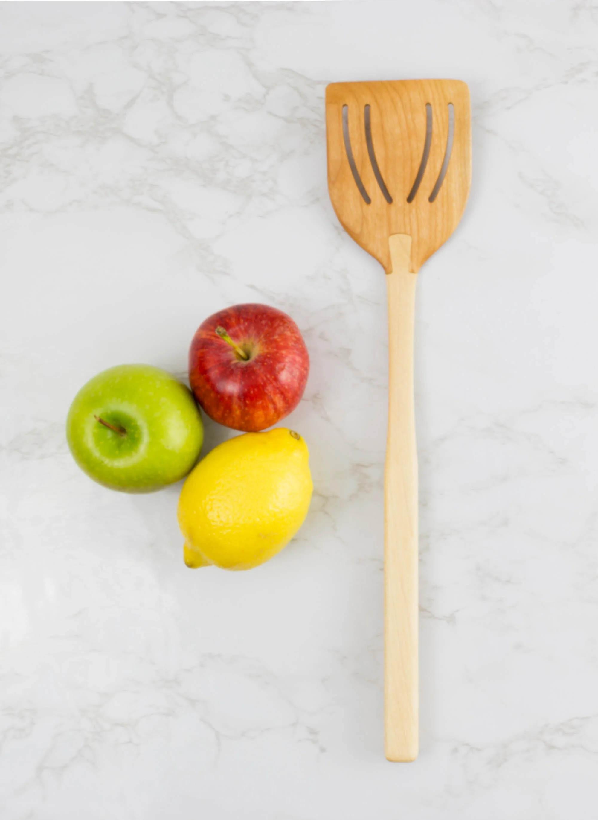 Cherry wood slotted spatula with a maple handle joined together with a strong and decorative dovetail joint. The contrasting colors of the wood create a unique two-toned appearance not typically seen in wooden kitchen utensils Finished with a 100% food-safe oil and wax finish (no solvents or harsh chemicals). Dimensions: 14" long x 3" wide x 3/4" high. Made in Massachusetts, USA.